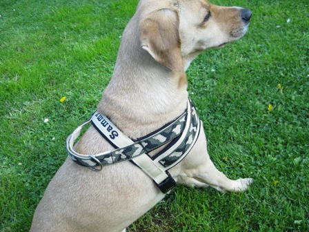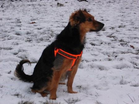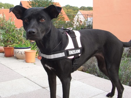 Jeanny, die Spanierin mit Spezial-Geschirr von Unico. Weich gepolstert mit Neopren, Gurtband in orange und Borte: waldelf. |