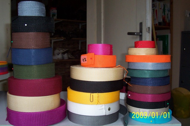 Hier eine kleine Farbenauswahl an Gurtband. Verschiedene Breiten sind möglich. Die Halsbänder, Geschirre etc. können individuell mit Namen, Telefon-Nr. o. ä. bestickt werden.