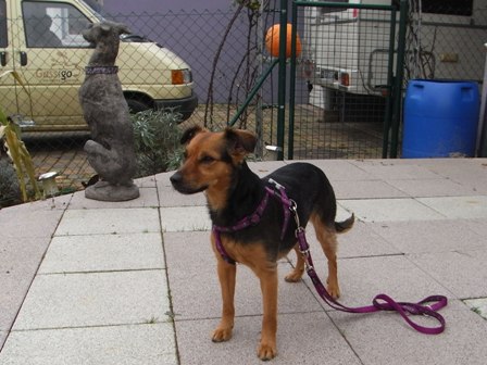 Jeanny, eine echte Spanierin mit Geschirr und Leine von Red Dingo in der Trend-Farbe lila. |
