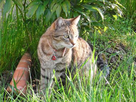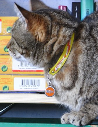 "Tiger" mit Sicherheitsverschluss-Katzenhalsband von Rogz for Dogz für: hot Dogs & cool Cats. Gravurplakette von RedDingo in Gr. S mit Fischbone in orange. |